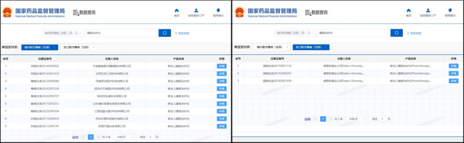 以黄疸治疗仪为例,在国家药监局官网检索“黄疸治疗仪”可以分别在境内医疗器械(注册)和进口医疗器械(注册)两个数据库分别查询到9条境内注册信息和3条进口注册信息。