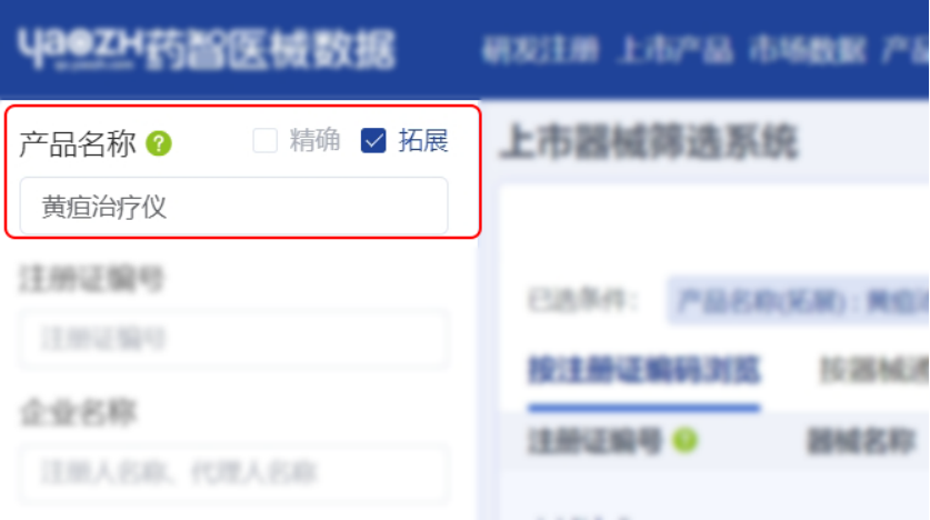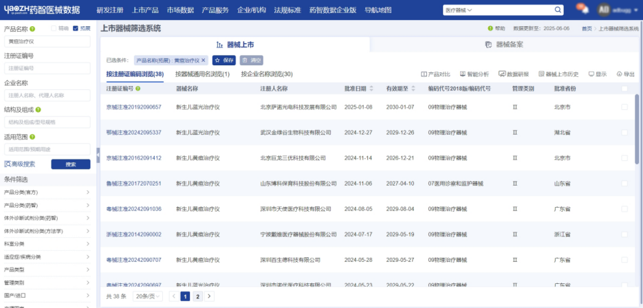 而在药智医械数据-上市器械筛选系统中,同样检索“黄疸治疗仪”,勾选拓展供功能,即可得到38条产品信息,其中国产产品35个,进口产品3个。