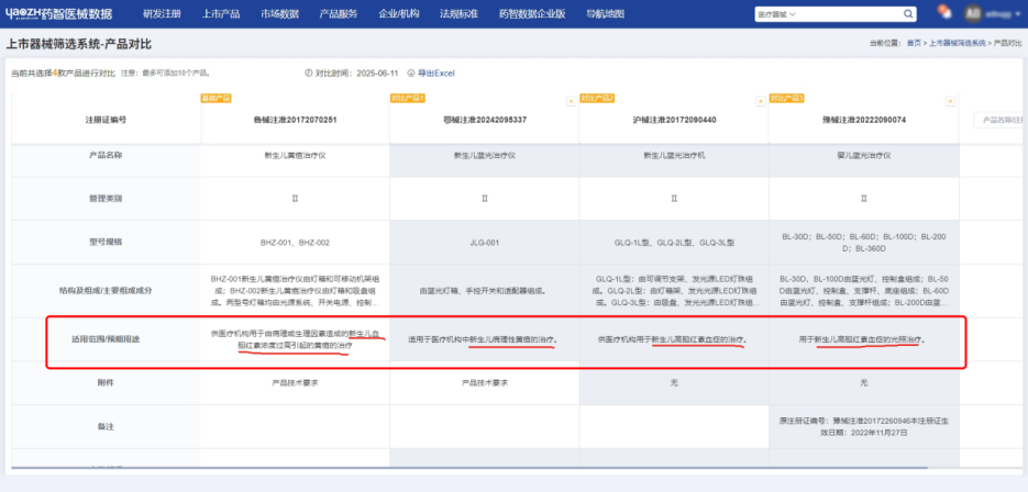 通过数据库中的产品对比功能勾选部分产品对比查看,可以看到虽然很多产品名称中没有包含“黄疸治疗仪”,但其适用范围/预期用途中都有关于黄疸治疗或降低血清胆红素浓度相关描述,可以看出这些的确也属于黄疸治疗仪。