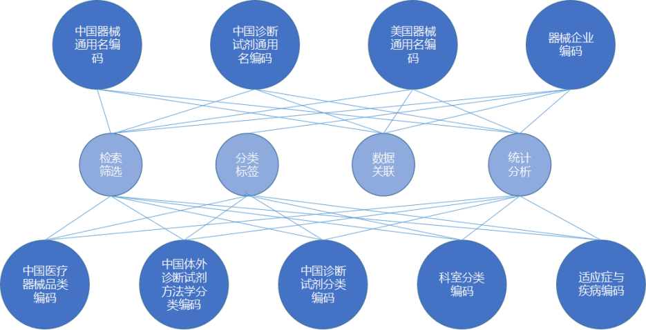 除了中国器械通用名编码,在行业专家的指导下,药智医械数据团队结合医疗器械行业相关政策法规、规章制度研发了器械企业编码、适应症与疾病编码、科室分类编码等多套底层数据编码。并将这些编码广泛应用于药智医械数据研发注册、上市产品、市场数据、产品服务、企业机构、法规标准等多个版块的近百个数据库中。这些编码相互配合,构建了一个完整的数据网络。通过对医疗器械数据的标准化处理和整合,药智医械数据确保了每一条数据都具有准确的标识和分类,从而实现了数据的全面性和一致性。有效保证了用户进行全面、准确、高效的信息检索与分析。
