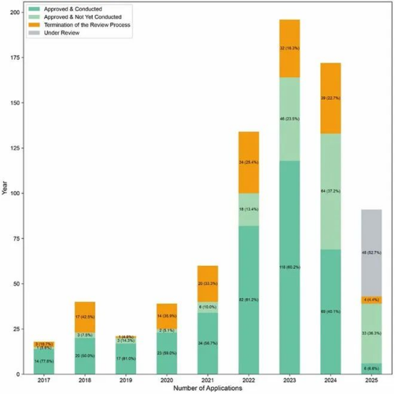 :早期临床试验(I 期和 II 期)占比约 60%,彰显中国在细胞与基因疗法领域创新探索的活跃。同时,III 期临床试验占比逐年上升,从 2017 年的不足 10% 增长到 2024 年的约 20% ,意味着越来越多疗法正走向成熟,有望进入临床应用。