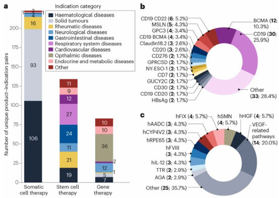 企业在推动细胞与基因疗法发展中扮演着关键角色。我国目前有超过 200 家企业参与到细胞与基因疗法的研发和生产中,形成了多元化的企业格局。其中既有大型药企,凭借其雄厚的资金实力和广泛的研发网络,在产品研发和产业化方面发挥着重要作用;也有众多创新型中小企业,它们专注于特定技术或靶点的研究,以灵活的创新机制为行业注入新的活力。