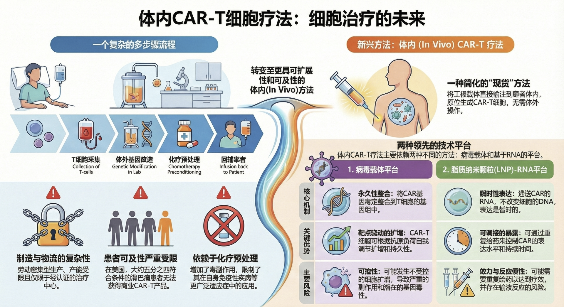 作用机制:无需抽血和体外培养,通过静脉注射 “基因递送载体”(慢病毒或LNP脂质纳米颗粒),直接在患者体内将T细胞改造成CAR-T细胞。
